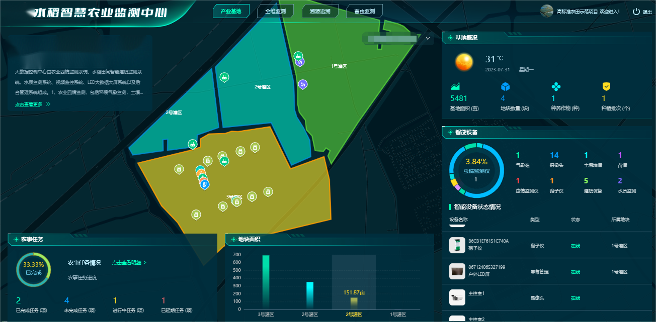 通過(guò)GIS二維地圖展示基地以及所在區(qū)域的地塊、農(nóng)作物、物聯(lián)網(wǎng)智能設(shè)備,可查看地塊、農(nóng)作物詳情、物聯(lián)網(wǎng)設(shè)備實(shí)時(shí)數(shù)據(jù)、歷史數(shù)據(jù)和實(shí)現(xiàn)設(shè)備遠(yuǎn)程操控。