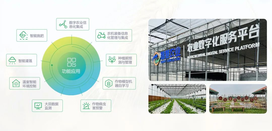 完備搭建了數(shù)字農(nóng)業(yè)信息化集成、智能施肥、智能灌溉、溫室智能環(huán)境控制、大田數(shù)據(jù)監(jiān)測(cè)、作物病蟲害預(yù)警、作物模型機(jī)器自學(xué)習(xí)、種植期預(yù)測(cè)與管理、農(nóng)機(jī)裝備信息化管理與集成等功能場(chǎng)景,賦能農(nóng)業(yè)生產(chǎn)。