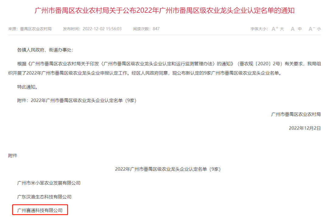 9、賽通科技獲番禺區(qū)級農(nóng)業(yè)龍頭企業(yè)認定