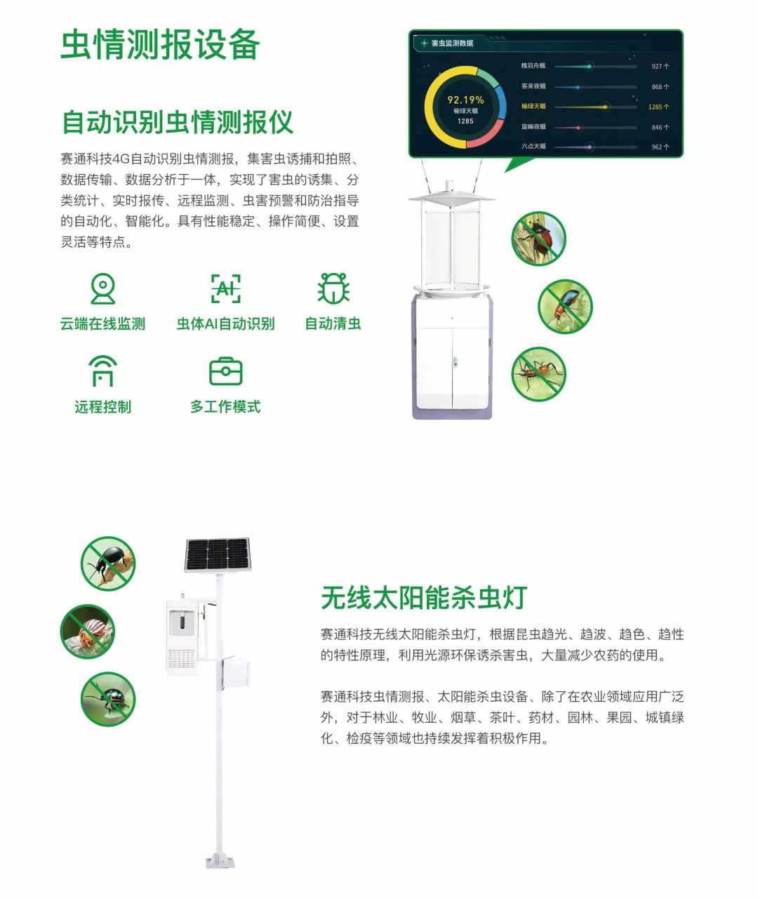 賽通科技蟲情測報設備可實現自動識別蟲情測報、誘集害蟲、預警防治,通過物理防治的手段大量減少農藥使用,保護土壤健康和糧食安全。