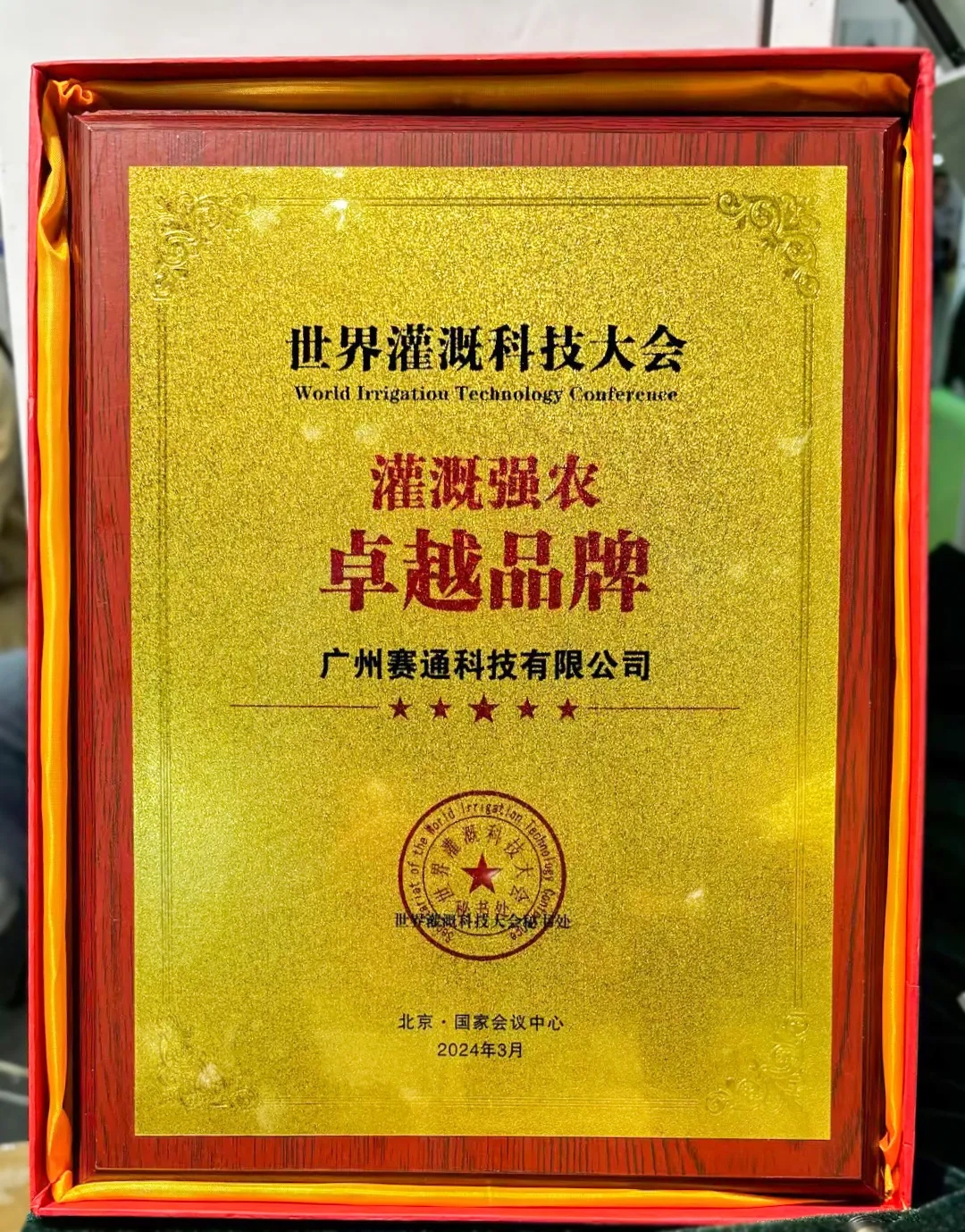 博覽會開展的“灌溉強農卓越品牌”評選吸引了全球超20萬的關注度,賽通科技有幸在激烈角逐中脫穎而出,于展會首日同期舉辦的授牌儀式中捧得榮譽。
