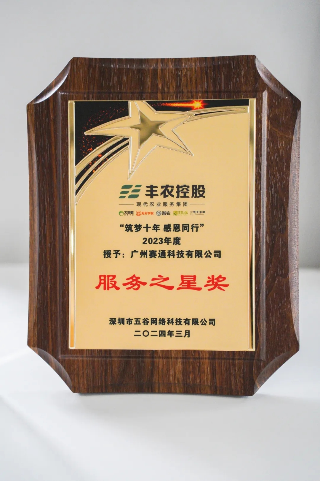 此前,深圳市豐農控股(集團)有限公司舉辦“筑夢十年 感恩同行”活動,授予廣州賽通科技有限公司“服務之星獎”,對于我們在2023年度作為供應商提供的產品服務予以好評。