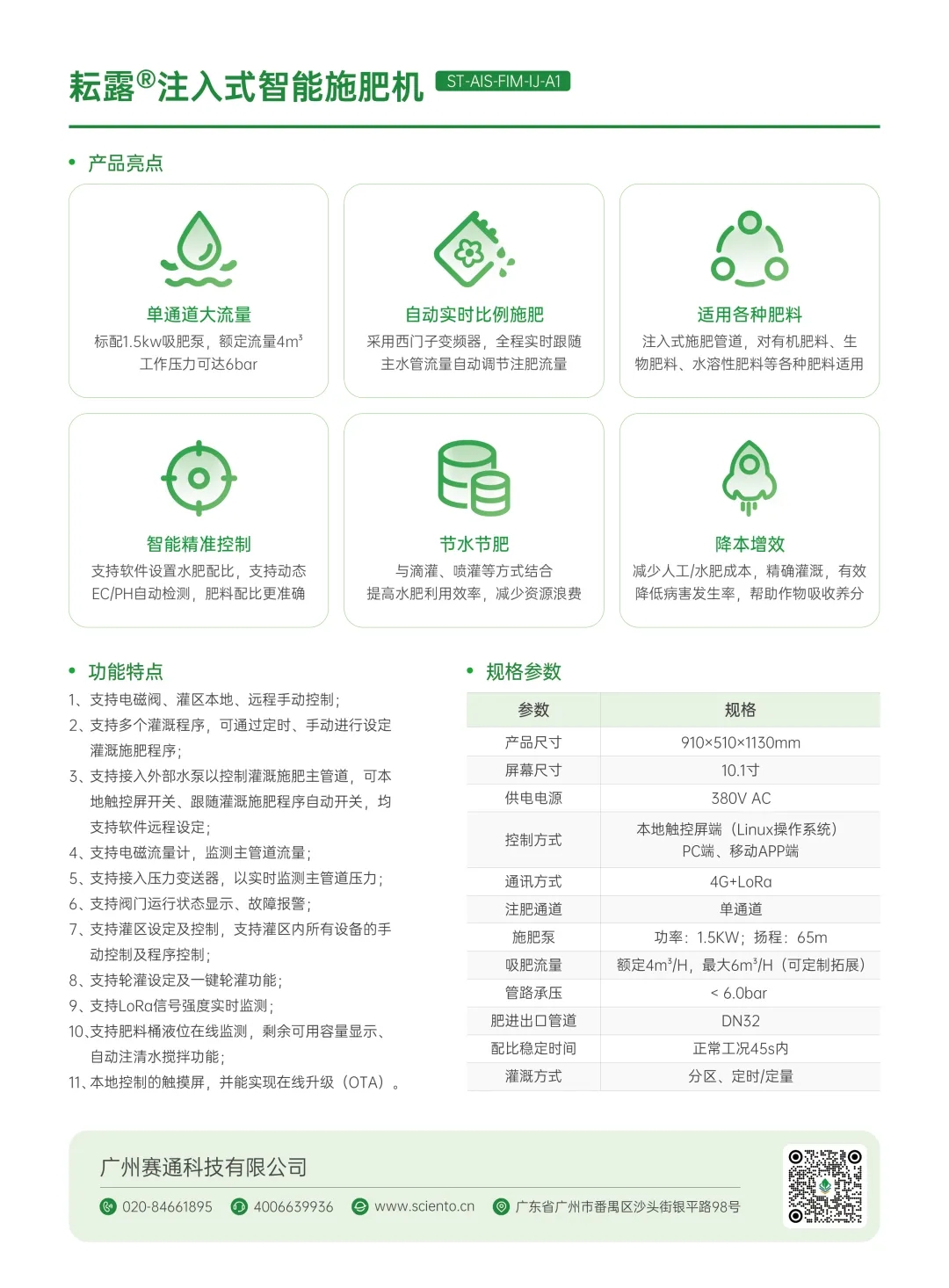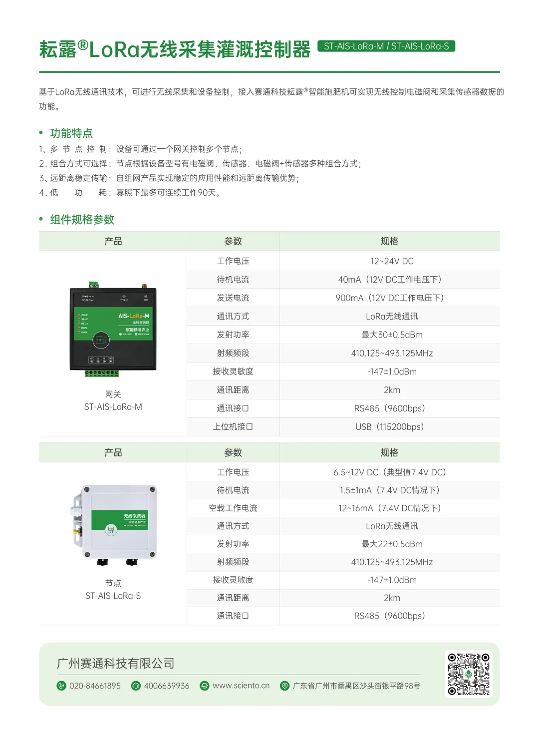 廣州賽通科技有限公司基于成熟的數(shù)字農(nóng)業(yè)研發(fā)經(jīng)驗(yàn)和產(chǎn)品實(shí)踐經(jīng)歷,以科技芯創(chuàng)新驅(qū)動水肥灌溉系列產(chǎn)品優(yōu)化升級,自主研發(fā)大流量、強(qiáng)注肥能力、適用各種肥料的注入式智能施肥機(jī);低功耗、長續(xù)航能力、通訊距離更遠(yuǎn)的LoRa無線采集灌溉控制器……