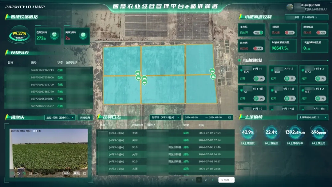 可視化大數據平臺:集成基地信息、物聯設備、農事信息等數據,搭建智慧農業經營管理平臺,將基地內設備運行概況、設備列表、實時監測、灌溉控制、防治情況等數據可視化,通過平臺進行基地內農業信息大數據動態展示。