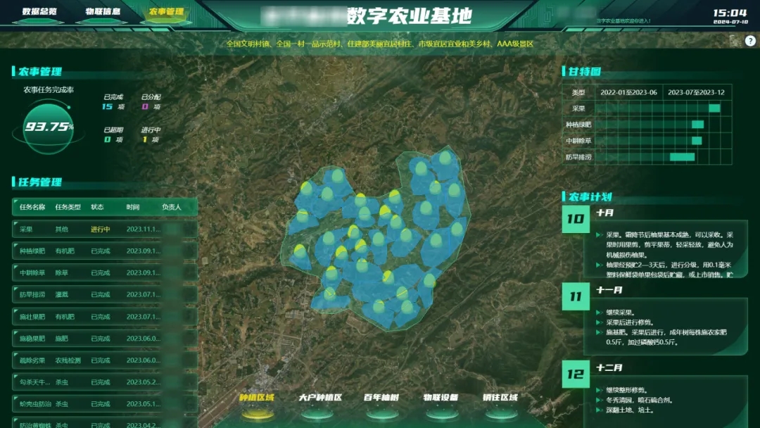 可視化大數據平臺:統籌種植區信息、物聯設備、農事任務等內容,可視化展示區域內設備狀態與控制、產品銷售溯源、農事計劃與管理等實時數據。