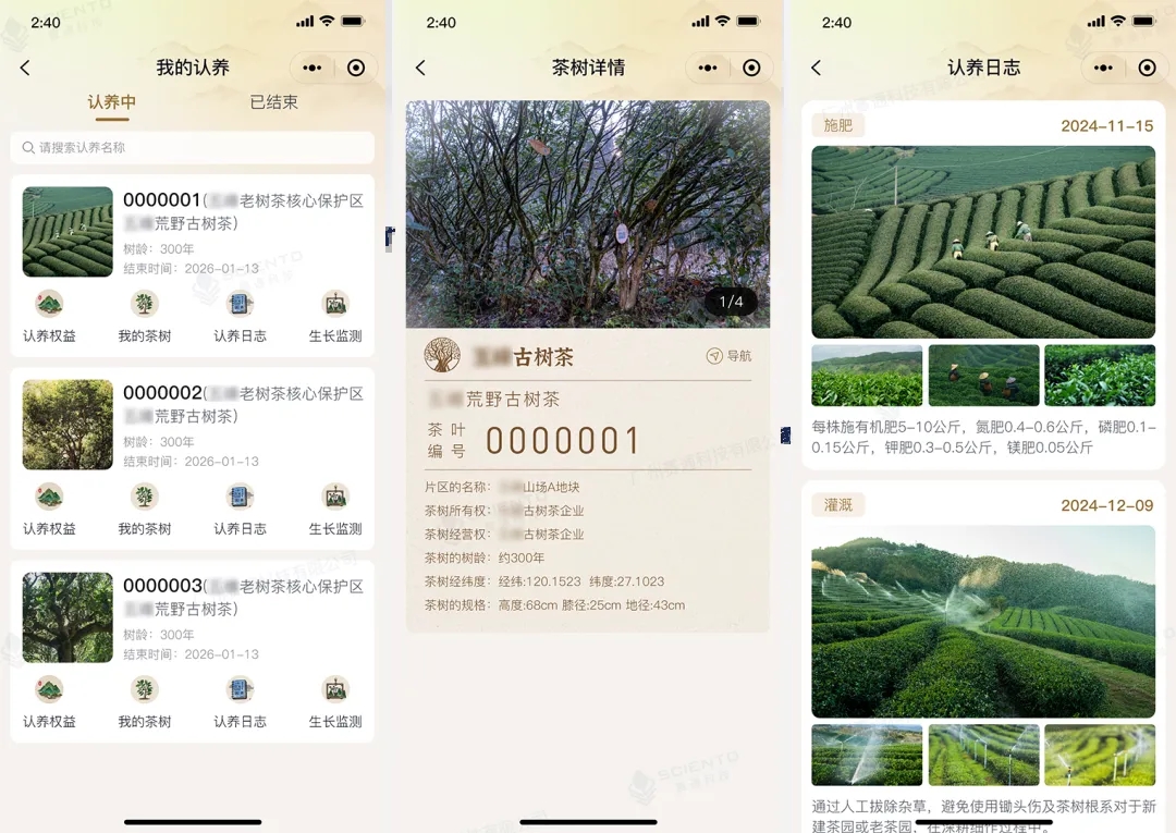 茶樹認養小程序還支持茶企信息展示、個人權益分發、商品物流跟進等服務板塊,為茶企客戶搭建從茶園到茶杯的全鏈數字化服務,打破傳統認養農業溝通成本高、認養進度跟進難、認養宣傳投入大等限制,構建茶企與認養用戶良性互動的消費生態。